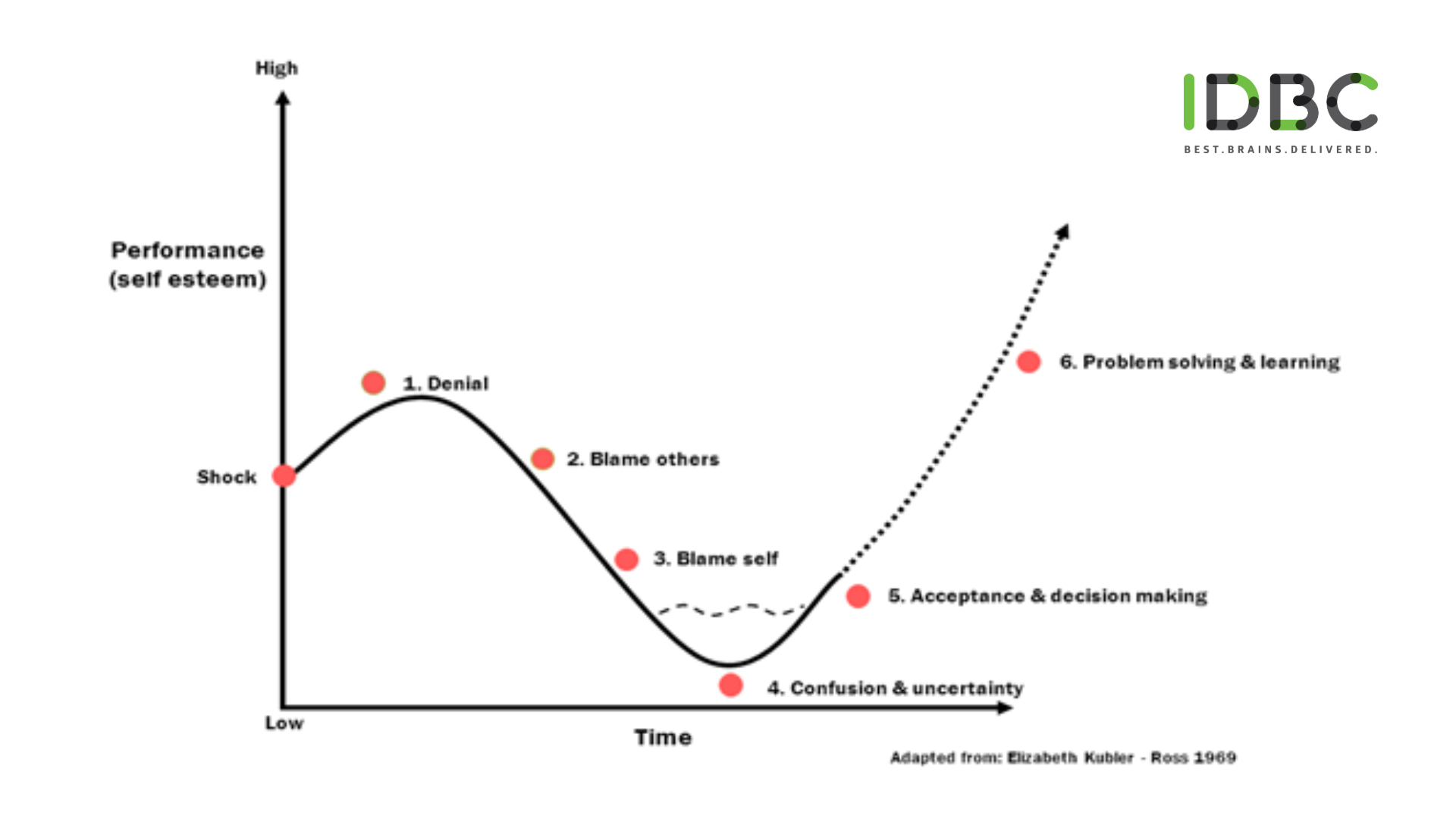 Elisabeth Kübler- Ross, gyászterapeuta és szakpszichológus elméletét emelte át az üzleti élet, ezzel segítségül hívva egy olyan módszert, amellyel gördülékenyebb a régi rutinból az újra megérkezni.